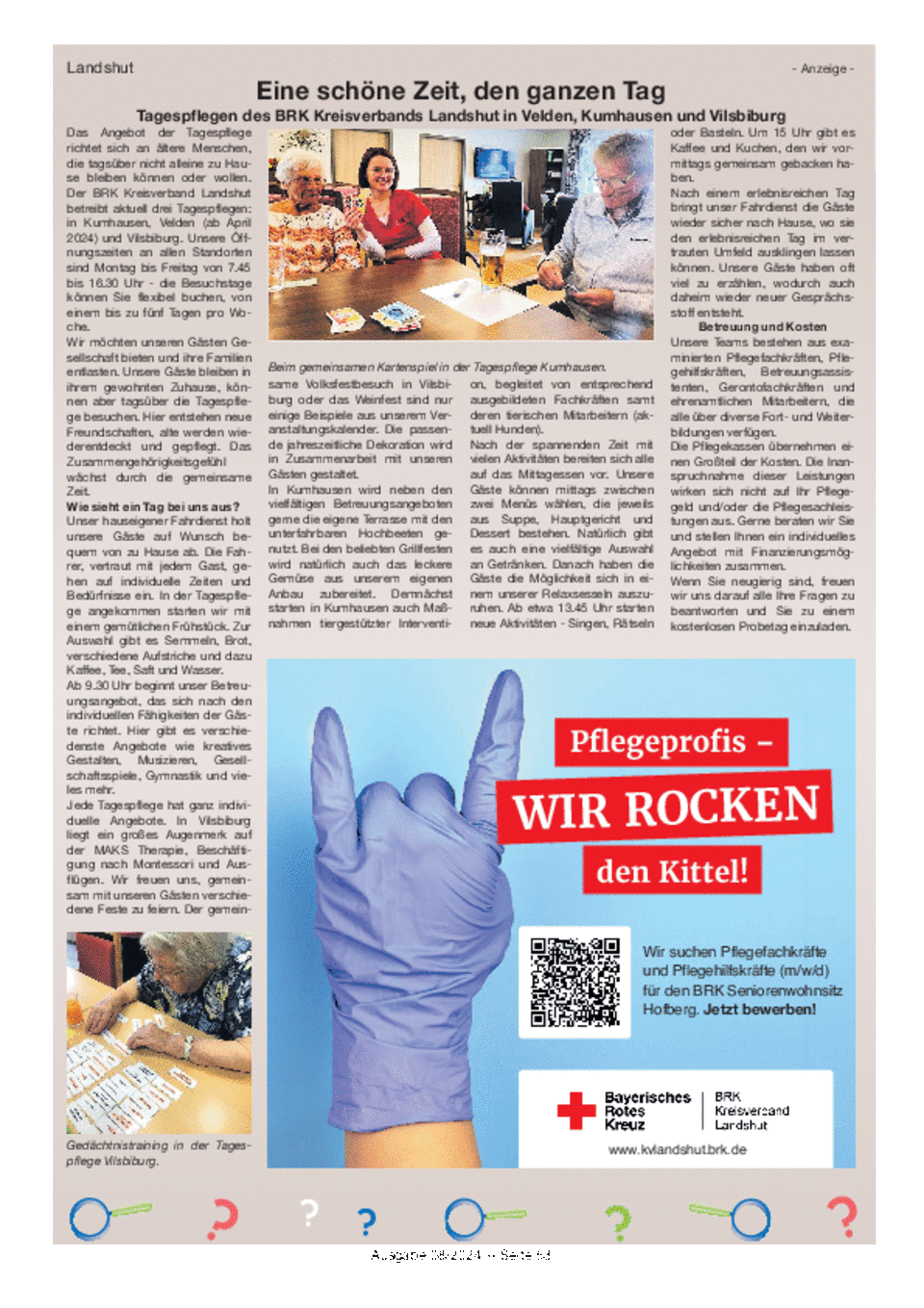 Die Tagespflege Kumhausen ist ein Ort, an dem Menschen zusammenkommen, neue Bekanntschaften knüpfen und ihren Alltag mit unserer Unterstützung so gestalten können, wie es gerade zu ihrer Tagesform passt: Zwanglos, heiter, gemeinsam, aber auch mit Rückzugsmöglichkeiten.