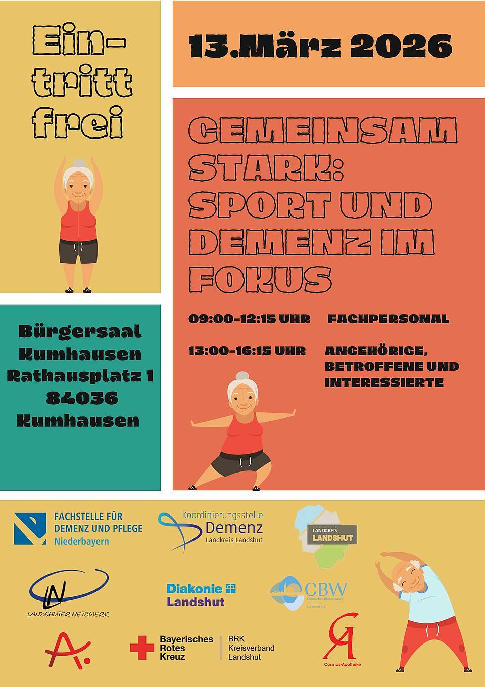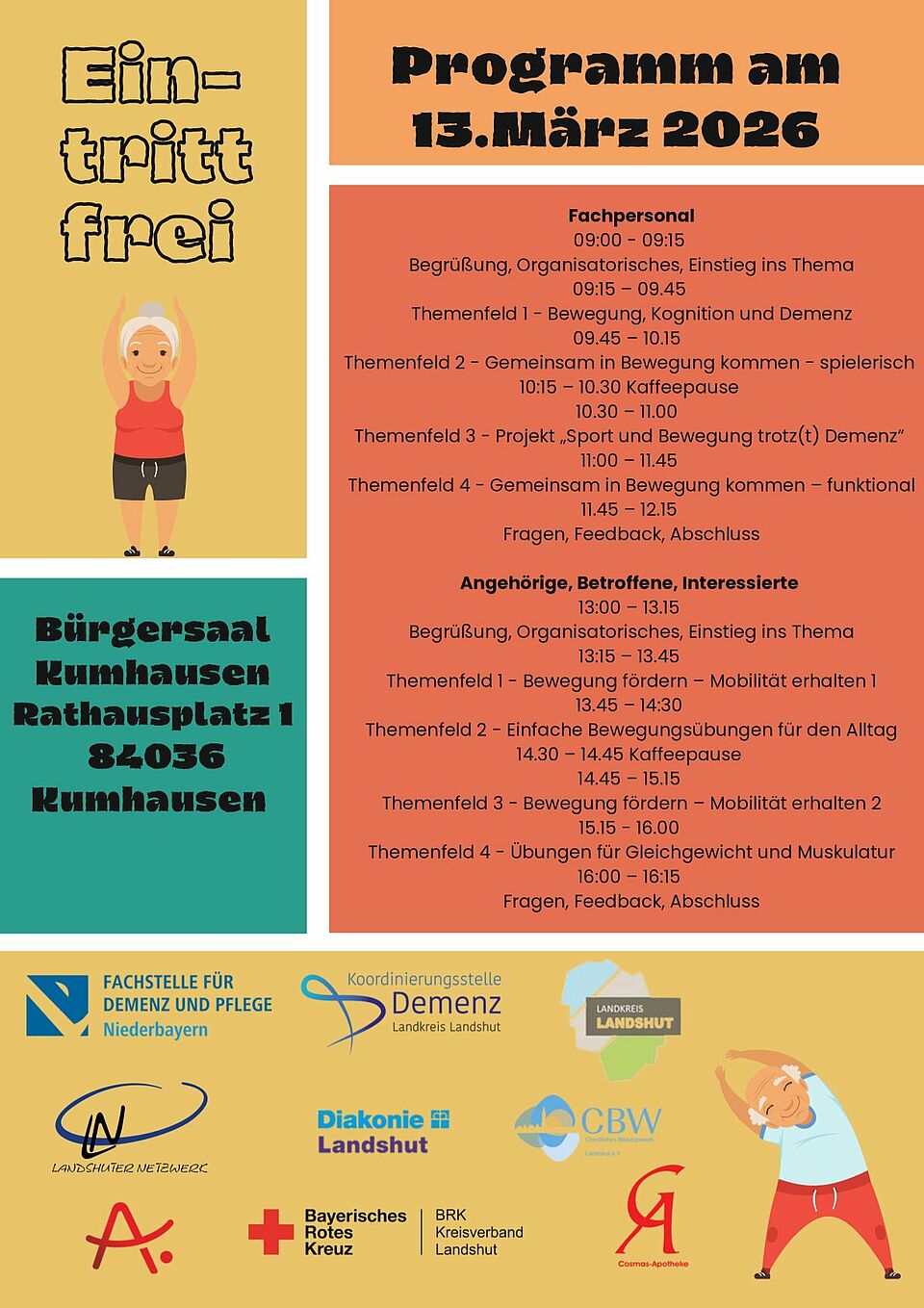 Der Aktionstag findet am 13.03.2026, von 09:00 bis 16:15 Uhr im Bürgersaal Kumhausen statt. Von 09:00 Uhr bis 12:15 Uhr ist ein Programm für das Fachpersonal geplant. Hierbei werden Ihnen verschiedenste Ideen und Themenfelder rund um das Thema Sport näher gebracht. Ab 13:00 Uhr widmet sich der Tag den Interessierten, Betroffenen und Angehörigen und vertieft die Möglichkeiten, Bewegung in den Alltag einfließen zu lassen.