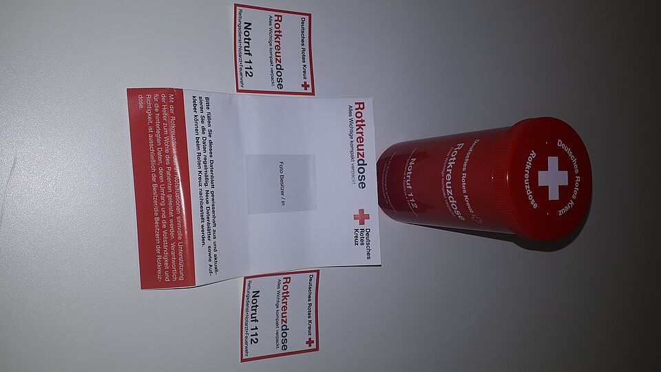 In die Dose kommen Medikamentenplan, Informationen über wichtige Vorerkrankungen, vielleicht auch der letzte Arztbrief. Eine Anleitung zum Ausfüllen ist auch in der Dose enthalten. Das alles wird dann in der Kühlschranktür deponiert. Zusätzlich sind bei jeder Dose zwei Aufkleber dabei. Einen für den Kühlschrank, einen für die Wohnungstür. Dadurch wissen die Retter, dass sich die Rotkreuzdose in ihrem Kühlschrank befindet.