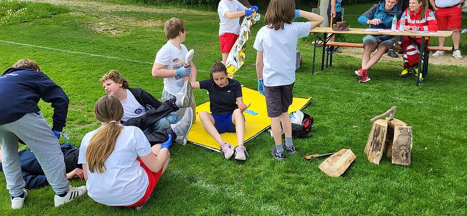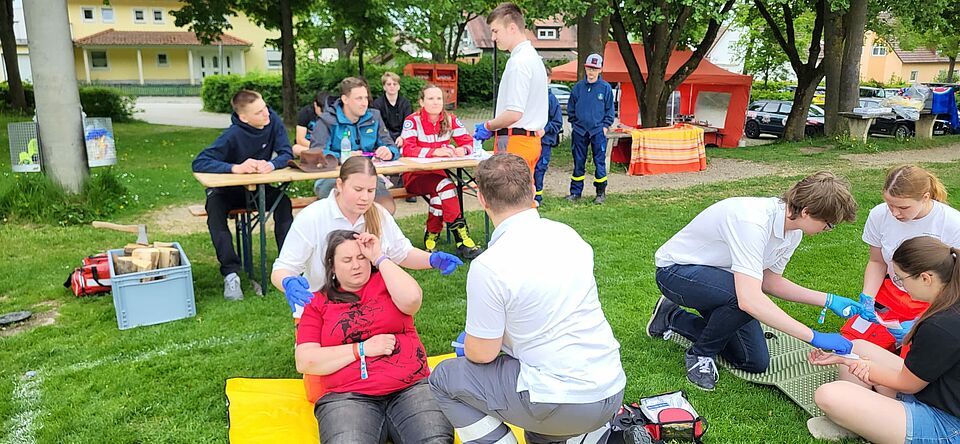 Besonders anschaulich präsentierte sich die Station EH-Praxis vor dem Landshuter Rathaus. Dort wurden mit realistisch geschminkten Verletzungen Unfallsituationen nachgestellt, die von den Teilnehmern im Alter von sechs bis 27 Jahren souverän versorgt wurden. Die Notfalldarstellung, ein eigener Fachbereich im BRK-Kreisverband Landshut, zeigte eindrucksvoll, wie wichtig realitätsnahe Übungen sind, um Helfer gezielt auf den Ernstfall vorzubereiten. Zahlreiche interessierte Bürgerinnen und Bürger nutzten die Gelegenheit, das Geschehen aus nächster Nähe zu verfolgen.