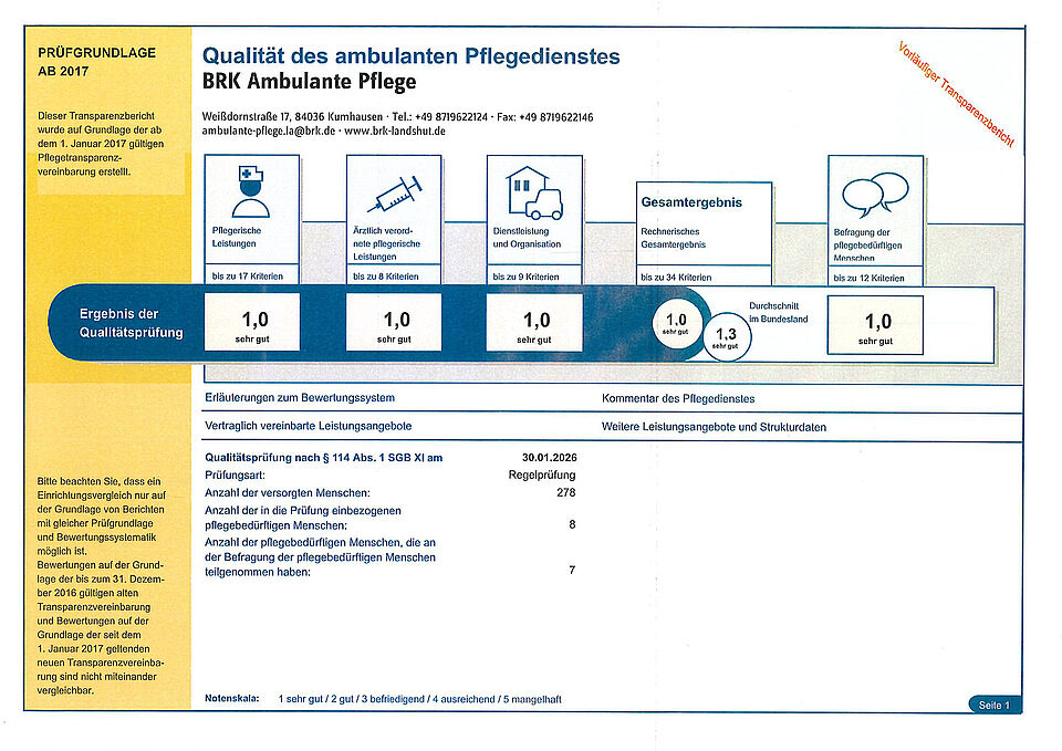 Am 30.01.2026 wurde die ambulante Pflege des BRK Kreisverbands Landshut vom Medizinischen Dienst (MD) geprüft. Das Ergebnis kann sich sehen lassen: Wir wurden mit der Note „Sehr gut“ bewertet!