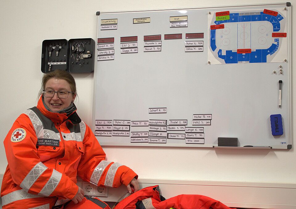 „Wir verteilen uns strategisch im Stadion“, so Bachhuber. Damit jeder weiß wo er zu stehen hat, hängt im Mannschaftsraum ein Taktikplan mit der Platzansicht des Stadions. Wie die Trainer der Eishockey-Teams legen auch die Sanitäter vor jedem Spiel ihre Aufstellung fest. Der Arzt steht zum Beispiel oft hinter der Spielerbank, weil er hier am meisten gebraucht wird. Bei Spitzenspielen kümmert sich das BRK Team um bis zu 5.000 Zuschauer plus die Eishockeymannschaften.