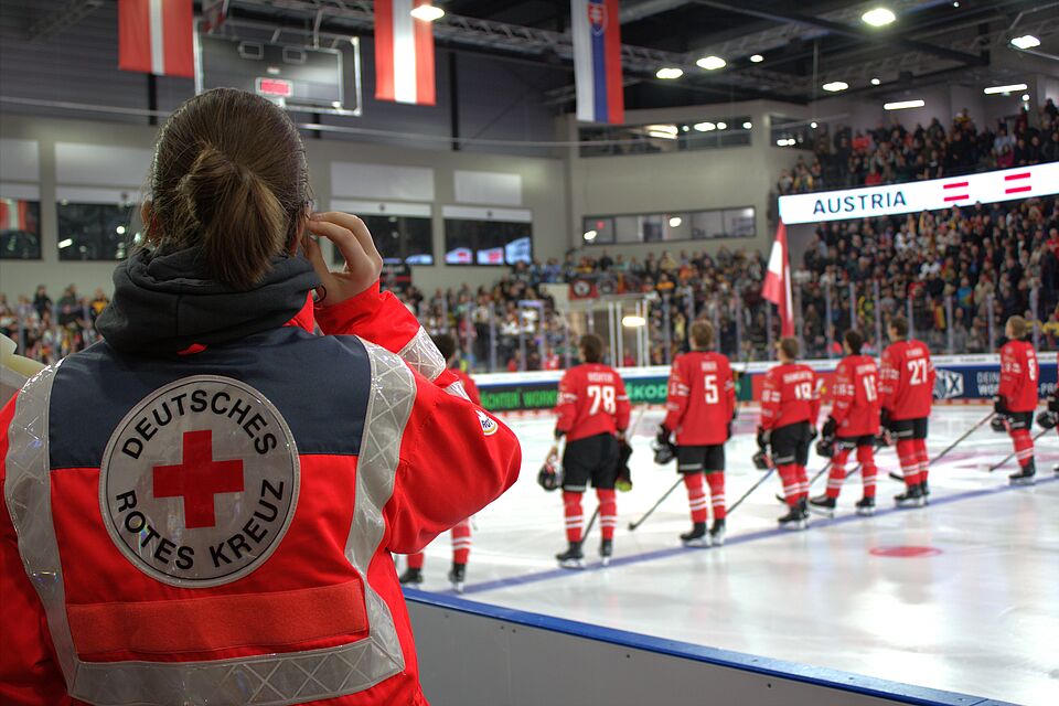 Auch auf dem Spielfeld kann es zu ernsten Verletzungen kommen – ein Puck, der unglücklich unter das Visier trifft, stellt beispielsweise ein großes Risiko dar. Bei Länderspielen sind die Nationalteams zwar mit eigenen Ärzten und Physiotherapeuten ausgestattet, doch im Notfall unterstützen auch BRK-Sanitäter die medizinische Versorgung auf dem Eis. „Es braucht Erfahrung, um in einer solchen Situation schnell und sicher über das Eis zum Patienten zu gelangen und dort die richtigen Maßnahmen zu ergreifen“, sagt Valentin Ostermaier. „Mit dem Notfallrucksack auf das Eis zu gehen, muss man vorher ein paar Mal gemacht haben.“