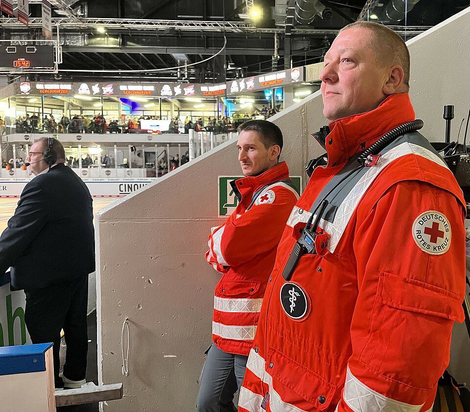 Während die Fans meist erst kurz vor dem Spiel eintreffen, hat die Arbeit für die BRK-Einsatzkräfte schon viel früher begonnen. Der Tag im Stadion begann für die Sanitäter an diesem Sonntag um 9:30 Uhr, das erste Spiel startete um 11:30 Uhr. Pro Schicht stehen rund zehn Sanitäter bereit, strategisch im Stadion verteilt. „An jeder Seite steht ein erfahrener Kollege mit einem jüngeren Teammitglied“, erklärt Andreas Bachhuber, Einsatzleiter des BRK. Er gehört zur Bereitschaft Buch am Erlbach, die federführend für die Organisation des Deutschland Cups beim BRK-Kreisverband Landshut zuständig ist. Zusätzlich begleitet ein Arzt das Team – in diesem Jahr das Ärzteehepaar Andreas und Regina Müller sowie Valentin Ostermaier. Besonders stolz ist Bachhuber auf Ostermaier, der nach seiner Zeit im Jugendrotkreuz und den BRK-Bereitschaften nun Notarzt ist. „Valentin ist unser Stolz, er hat das Handwerk von der Pike auf gelernt“, erzählt Bachhuber, während Ostermaier konzentriert die Spielfläche beobachtet. Er behält sowohl die Spieler als auch die Zuschauer im Auge und scannt mit geschultem Blick, ob alles ruhig ist, ob jemand aufgeregt nach Hilfe winkt oder sich auf dem Spielfeld eine gefährliche Situation anbahnt. „Die Konzentration bleibt hoch, auch in der Drittelpause“, sagt Ostermaier. „Die Lautstärke macht es nicht leichter – während des Jubels verstehen wir kaum die Funkgeräte, dann heißt es, noch aufmerksamer sein. Erst nach dem Spiel merkt man, was man geleistet hat, auch wenn kein Notfall eintritt.“