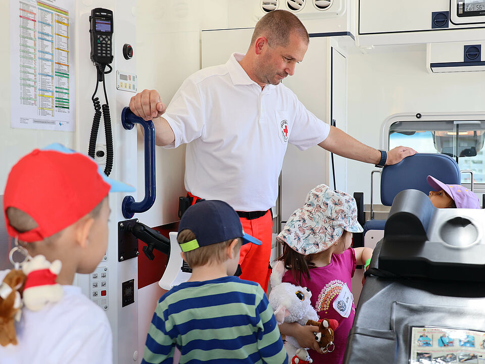 Bei unserem Notfallsanitäter-Team erfuhren die Kinder, wie ein Rettungseinsatz abläuft, und erkundeten den Rettungswagen. Ein Rettungseinsatz kann besonders für Kinder stressig sein – Lautstärke, Schmerzen, unbekannte Menschen Uniformen und die Ungewissheit, was passiert. Durch das Kennenlernen des Rettungswagens und unserer Rettungskräfte in lockerer Atmosphäre konnten die Kinder diese Ängste abbauen und besser verstehen, was in einem Notfall geschieht.